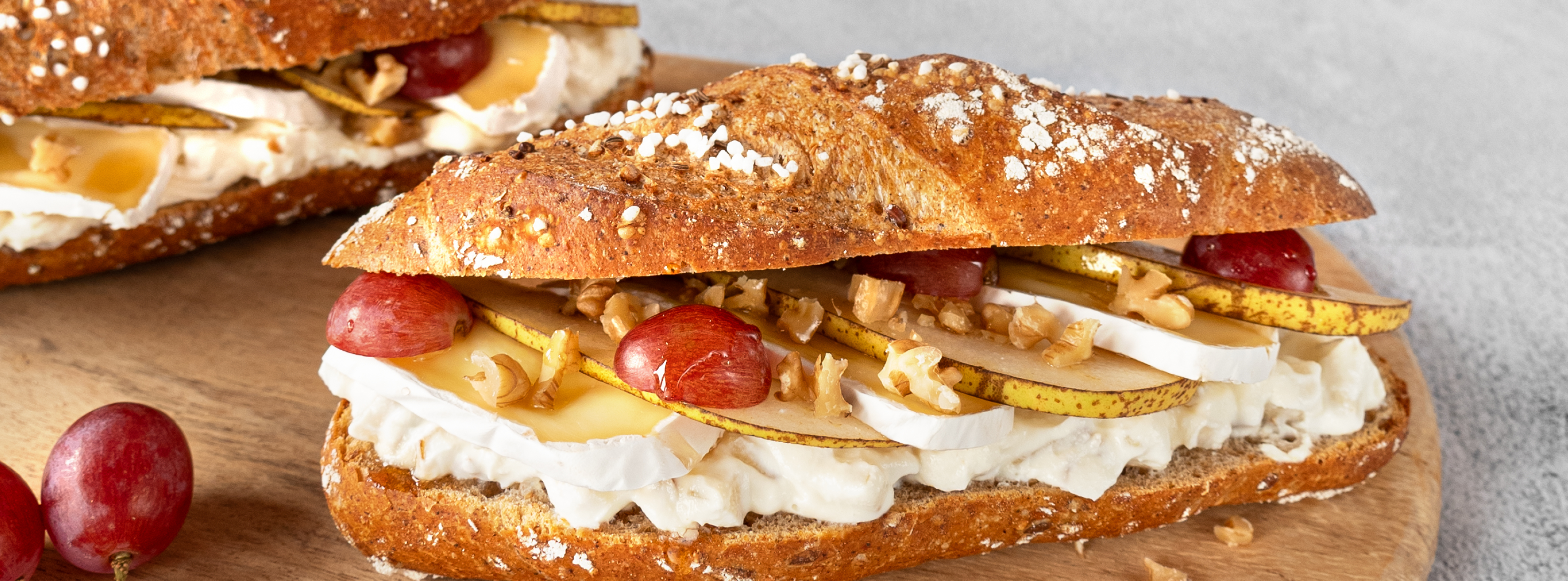 Einen Teil der Birne reiben und mit dem Topfen/Quark und den gehackten Walnüssen vermischen. Diese Mischung auf der unteren Hälfte eines Kornspitzes verteilen. Den in
