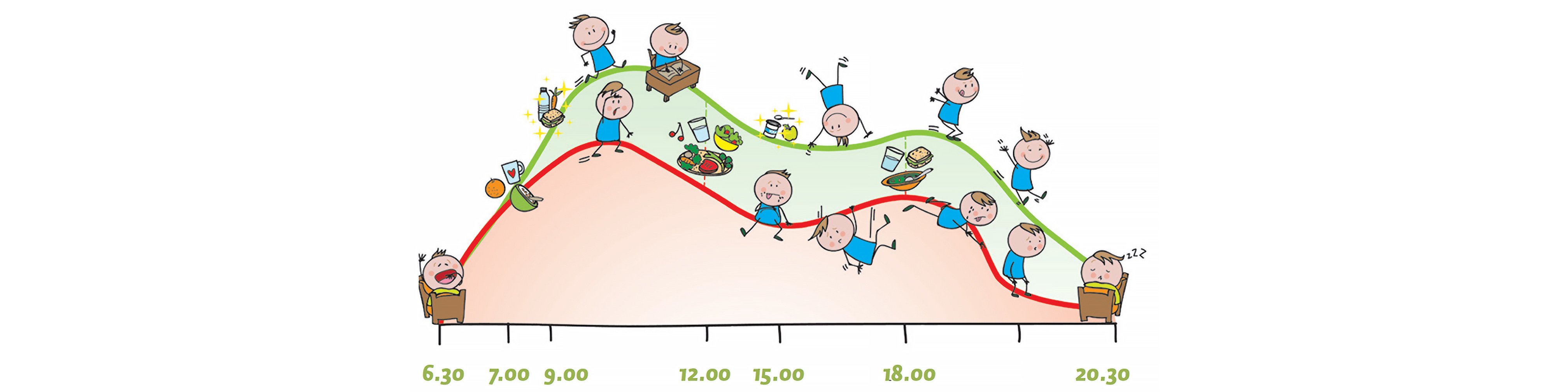 Children generally burn more energy than adults, so five smaller meals spread over the day are often better than three large ones. The right snack can boost your performance – you are more active and alert. Adults can also prevent performance slumps during the working day by eating 3 – 5 smaller meals.