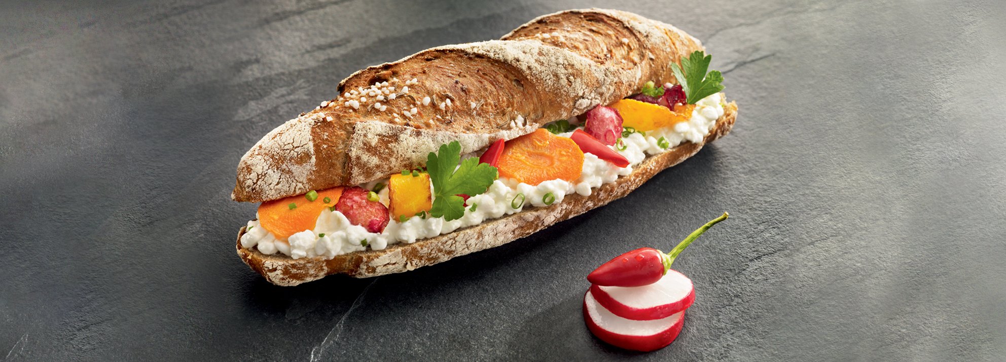 Cut open the Kornspitz, spread with cream cheese and top with the vegetables and parsley. Round things off with some chopped chives and there you have it. Bon appƩtit and enjoy autumn!