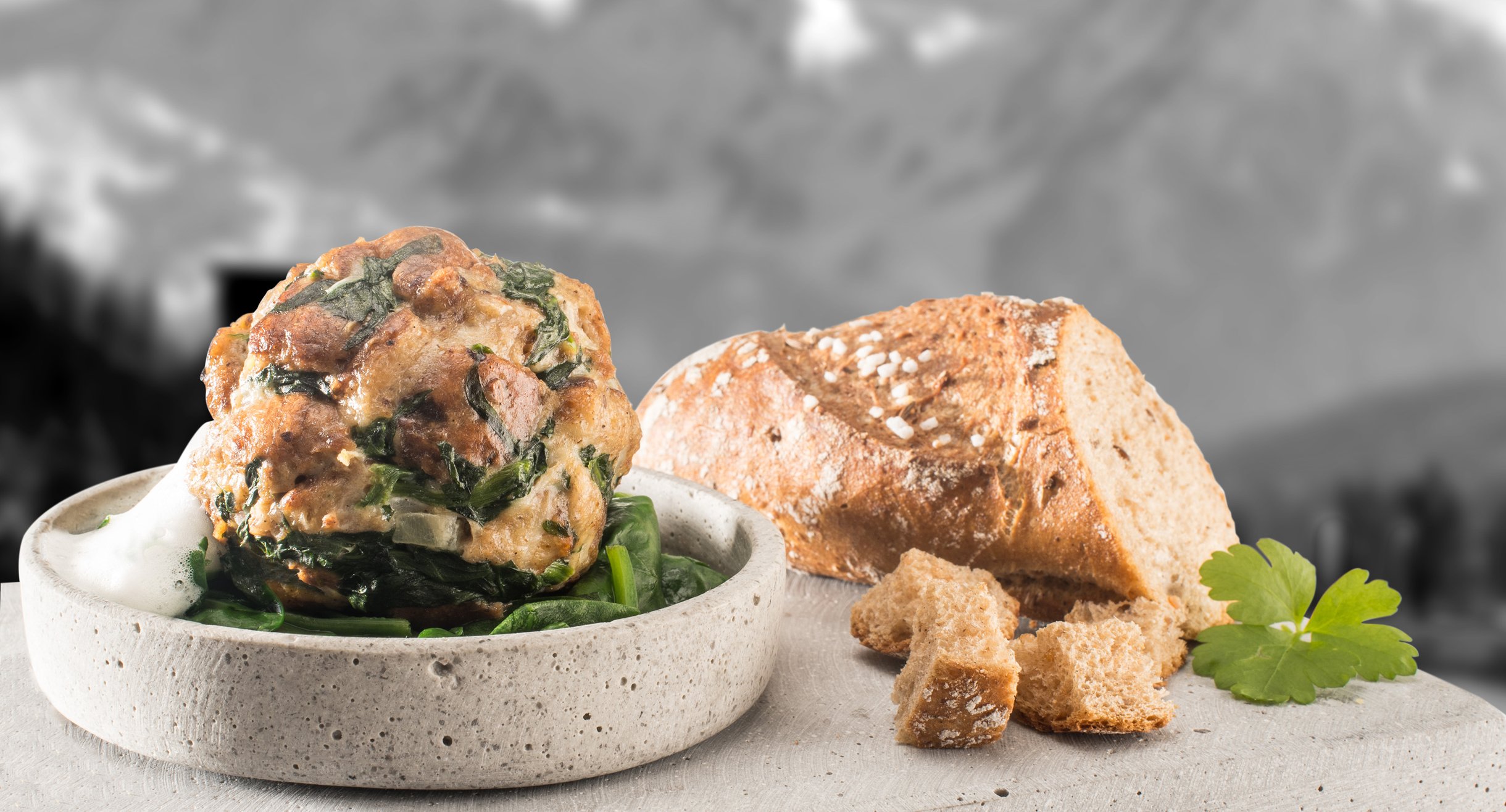 Start by cutting the Kornspitz into evenly-sized cubes. Dice the onion and sautĂ© in butter until glassy. Add the fresh spinach, simmer briefly and then pour in the cream. Remove from the heat, season with salt, pepper and a little nutmeg and then leave to cool slightly. Take your Kornspitz cubes and mix well with the spinach-cream mixture and the eggs. Lastly, add a little flour to bind the mixture and to make sure that the dumplings retain their shape during cooking. Two things are important here. First: itâs okay to use flour, but donât overdo it, otherwise you could throw them at the wall and theyâd be guaranteed to bounce back! Secondly, mix the ingredients together gently and do not knead them into a dough. When the dumplings become too firm, they no longer cook properly and have all the appeal of a tennis ball. If you take a look at the photo, you can still clearly see the Kornspitz cubes. Gently boil the dumplings (about 5-6 cm in diameter) in lightly salted water for about 10 minutes.