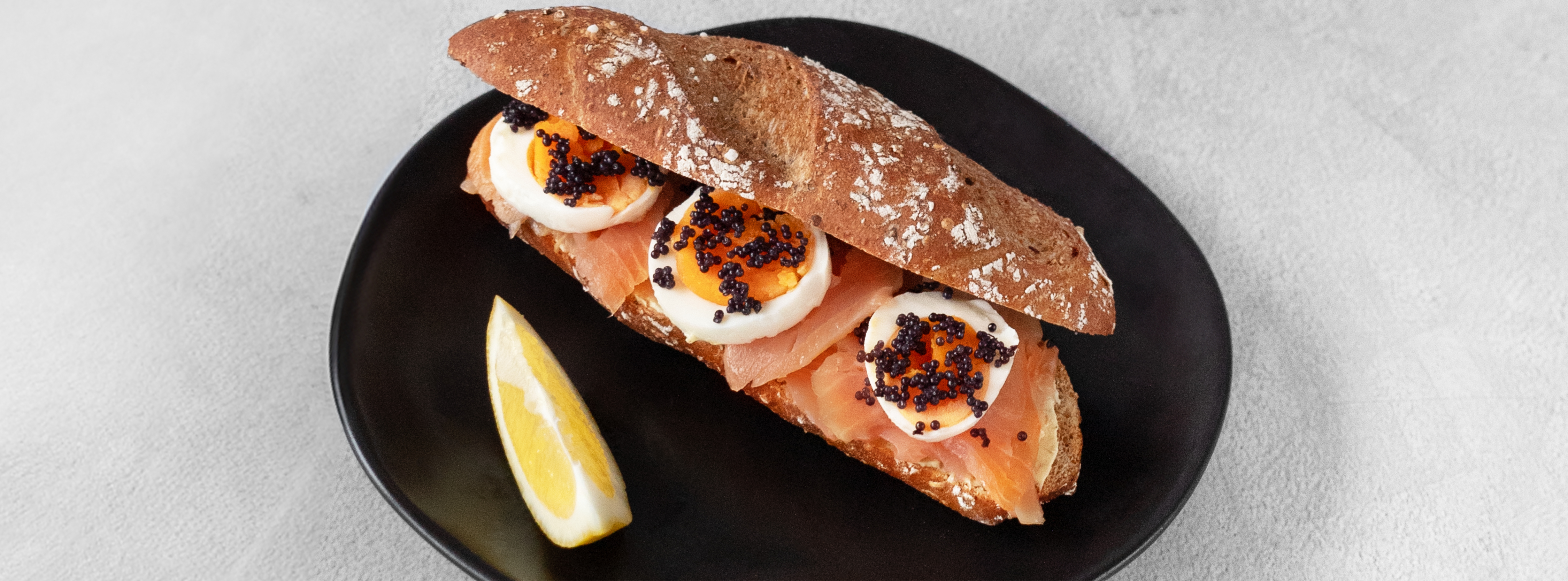Leave the butter at room temperature until soft, then beat it until light and fluffy. Add the crushed garlic and herbs of your choice (e.g. dill, lemongrass, coriander). For even more depth of flavour, add a bit of your favourite mustard. Season with salt and pepper. Spread herb butter onto the bottom half of the Kornspitz and top with smoked salmon. Add 2 ā 3 slices of boiled egg and garnish with caviar. Finish with a few drops of freshly-squeezed lemon juice.