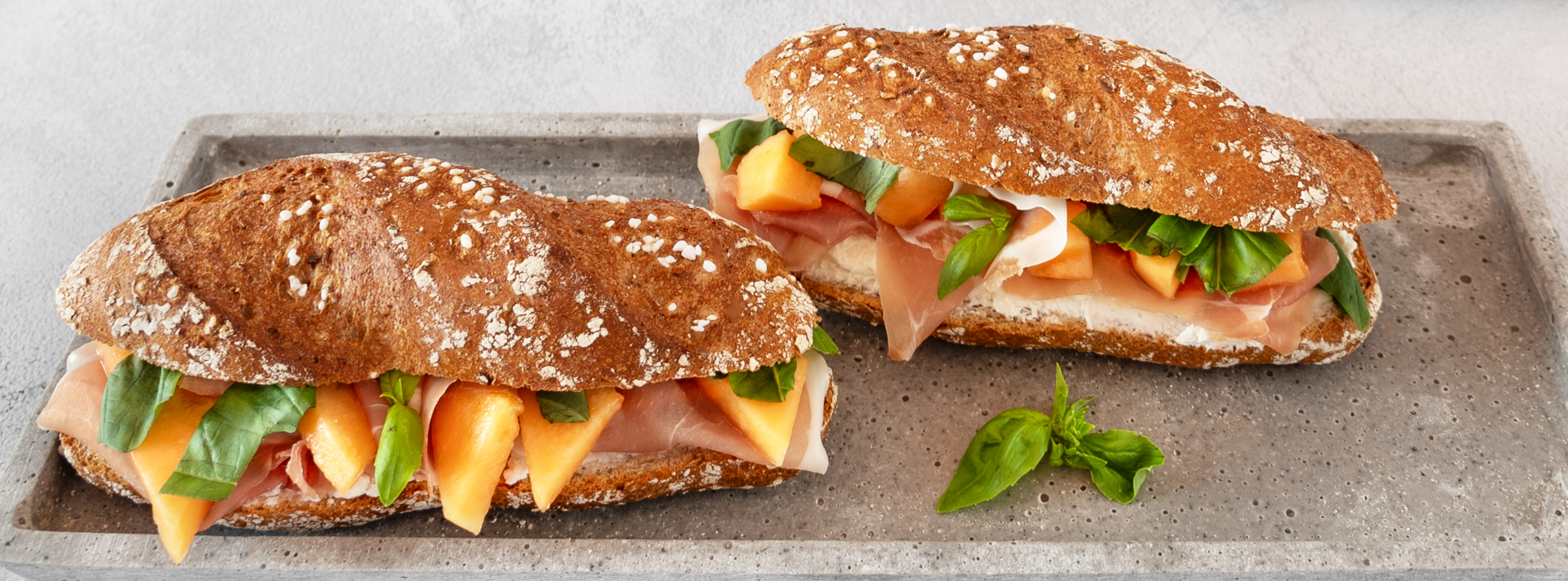 Cut the melon in half, scoop out the seeds, then cut into quarters and remove the rind. Use a very sharp paring knife, a vegetable peeler or a mandolin slicer to thinly slice each piece into ribbons. Season the ricotta with a little salt and spread it onto the bottom half of the Kornspitz. Arrange alternate slices of melon and prosciutto on the ricotta. Garnish with roughly torn basil leaves.